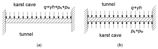 Then, the load is substituted in Equation (1). When the cavity is above the tunnel, the maximum bending moment and maximum shear force are calculated in Equations (3) and (4):