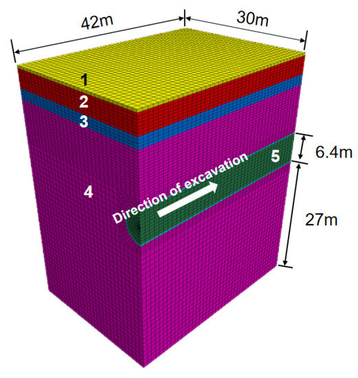 The model size is 42 m in the direction along the tunnel, the model width is 30 m, and the distance from the bottom of the tunnel to the bottom of the model is 27 m.