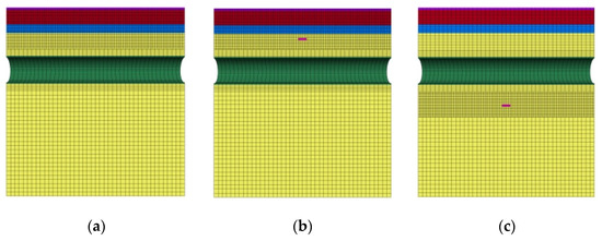 Schematic diagram of the location of the tunnel and the cave: (a) Tunnel without caves; (b) Cave at critical safety distance above the tunnel; (c) Cave at critical safety distance below the tunnel.