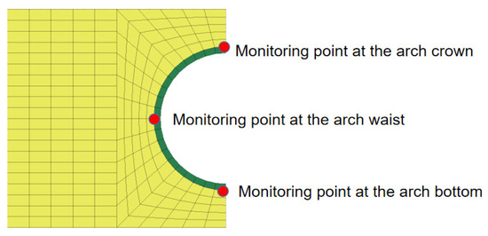 As Table 3 shows, the minimum principal stress of the arch bottom is greater than the minimum principal stress of the vault. The minimum principal stress of the arch waist is about 2.7 times that of the minimum principal stress of the vault. The maximum principal stress of the arch waist is about 2.1 times that of the maximum principal stress of the arch bottom.