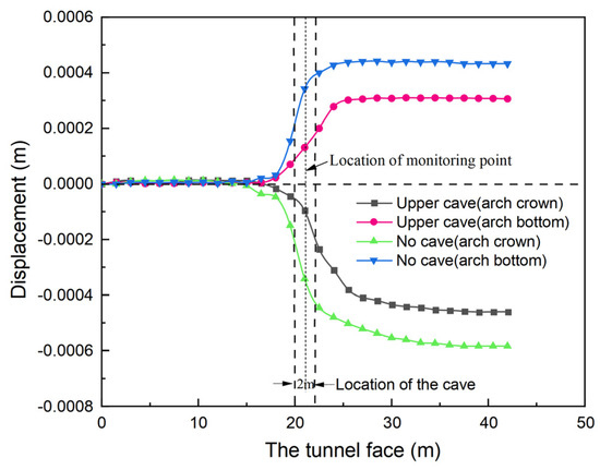 Monitoring the vertical displacement of the vault and arch bottom at 21 m during the excavation of the tunnel without a karst cave and with a lower karst cave, as shown in Figure 9, showed that the influence of the upper and lower karst caves on the vertical displacement of the tunnel is not obvious at the critical safety distance.