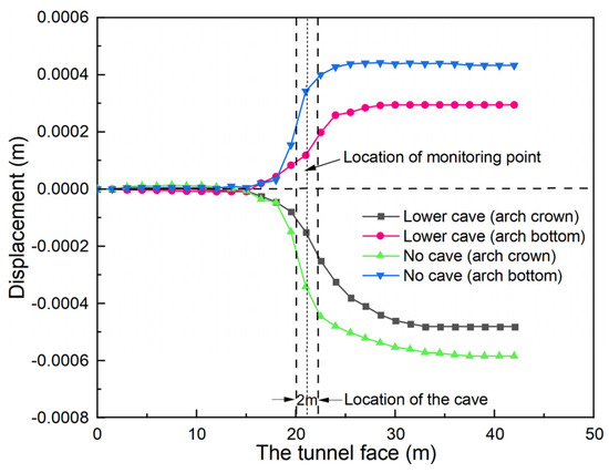 When the tunnel is excavated to 25 m, the deformation of the arch bottom without a karst cave increases by 46.7% compared to that with a karst cave. When the tunnel is excavated to 35 m, the deformation of the arch top without a karst cave increases by 26.1% compared to that with a karst cave. Overall, the settlement of the surrounding rock at the bottom of the arch is smaller than that at the top of the arch.