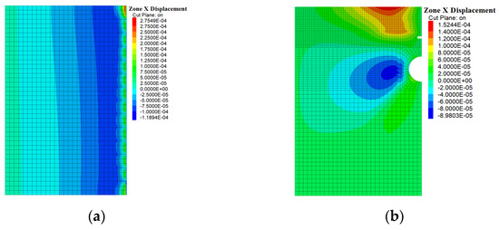 With the continuous advancement of the tunnel face, the soil displacement under the disturbance of shield excavation is also changing. After the completion of the tunnel excavation, the vertical displacement cloud diagram of the three cases of no karst cave, upper karst cave and lower karst cave are shown in Figure 5, Figure 6 and Figure 7, respectively.