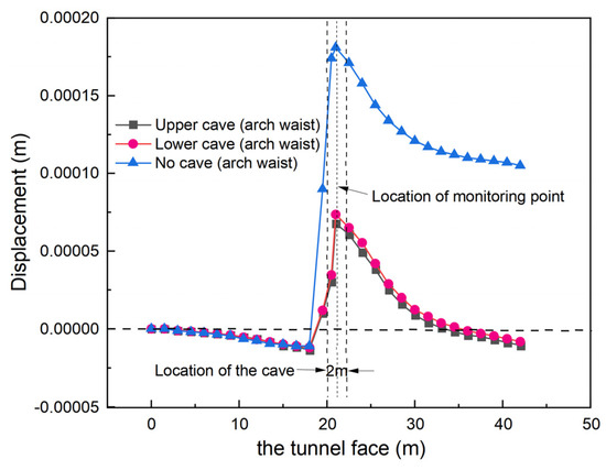 The specific horizontal displacement change process is shown in Figure 13. When the tunnel is excavated to 10 m, it has had a significant impact on the lateral deformation of the arch waist of the tunnel face at 21 m. When there is no karst cave development and when the karst cave development is in the upper and bottom part of the tunnel, the transverse deformation value at the haunch of the 10 m section is 0.007 mm, 0.005 mm, 0.005 mm, respectively.