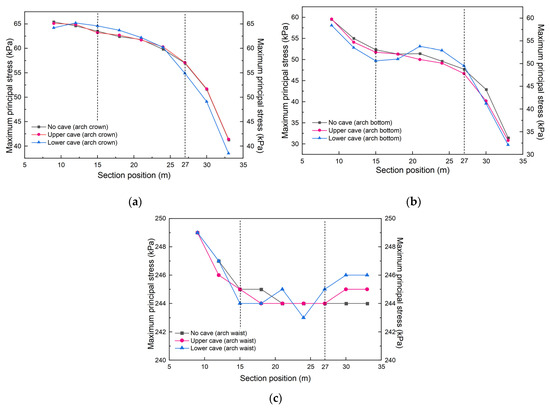 To eliminate the influence of the edge effect of the model size, the data between the 15 m and 27 m sections were selected for analysis. It can be seen from Figure 14a that the maximum principal stress of the vault without the karst cave, and with upper and lower karst caves, gradually decreases with the increase of the tunnel section position. However, the maximum principal stress of the vault at each section is not much different. Under the condition of critical safety distance, the upper karst cave has no obvious influence on the maximum principal stress of the tunnel vault. The lower karst cave has no obvious effect on the maximum principal stress of the tunnel vault.