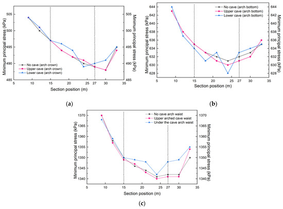 Similarly, the data between the 15 m and 27 m sections were selected for analysis. As shown in Figure 15a, there is no significant difference in the minimum principal stress at the vault between the cavity-free and upper cavity cases. Compared with the no-cavity case, the minimum principal stress in the vault of the lower cavity increases by 2 kPa between 18 m and 21 m and decreases by 1 kPa at 24 m. When the distance between the cavity and the tunnel is the critical safety distance, the cavity above the tunnel has no obvious effect on the minimum principal stress in the arch, and the effect on the minimum principal stress in the arch of the cavity below the tunnel is obvious.