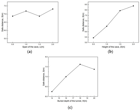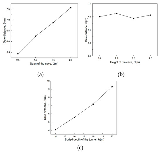 Trend of safety distance of upper caves under the influence of various factors: (a) Span of the cave; (b) Height of the cave; (c) Buried depth of the tunnel.