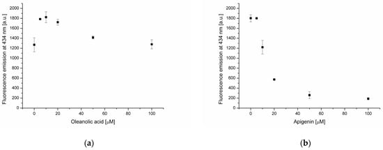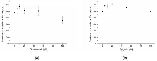 In subsequent experiments, the impacts of phenolic compounds on phosphatidylcholine membranes enriched with 20 μmol of OA were investigated. In the case of apigenin (Figure 6b), the decrease of the liposomes’ hydrodynamic diameter from about 275 nm to about 140 nm at 100 μmol of AP was found. Banerjee and co-workers [33,34] prepared distearoyl phosphatidylcholine (DSPC) liposomes containing apigenin (DSPC:apignin ratio—2.5:1). They found, in two experiments, that the hydrodynamic diameter of membranes loaded with AP was slightly higher (103.2–104.3 nm) in comparison with empty DSPC (91.84–94.07 nm). The increased diameter of membranes loaded with AP suggests the formation of hydrogen bonds between flavonoids and the hydrophilic part of the bilayer [35,36], as confirmed in studies with dipalmitoyl phosphatidylcholine (DPPC) membranes. However, it is also possible that hydrophobic interactions between apigenin and the phospholipid membrane are involved [33]; the location of AP in the hydrophobic region of the membrane was confirmed by DPH fluorescence measurements in our experiment. The decrease of the liposomes’ hydrodynamic diameter in the presence of AP in our study is probably due to the effect of OA on the structure of the bilayer, thus modifying the action of apigenin.