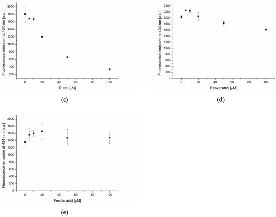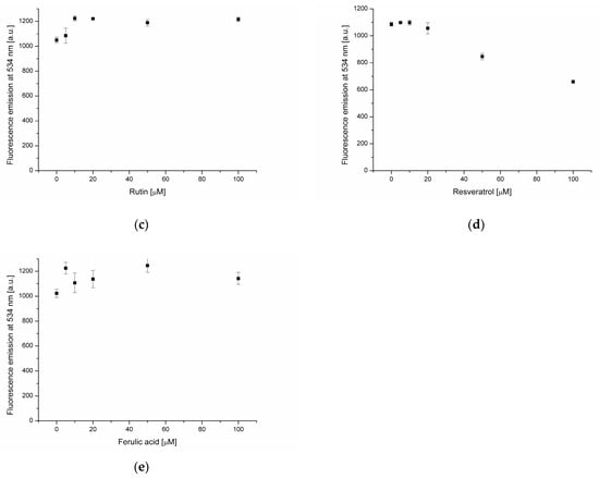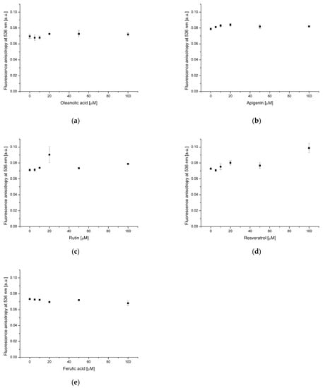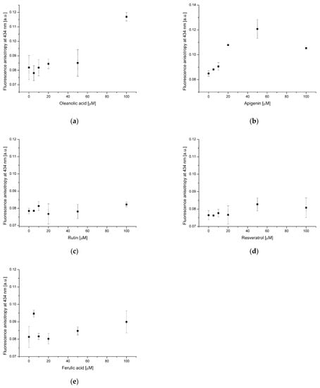 A previous study reported that flavonoids have the ability to quench DPH emission [27]. In the case of apigenin and rutin (Figure 3b,c) a strong decrease of DPH fluorescence in the presence of these two flavonoids was recorded. This phenomenon is due to the incorporation of AP and RT into the hydrophobic core of the membrane, where the probe is present. No statistically significant changes in DPH fluorescence were found in the presence of ferulic acid, indicating its absence in the hydrophobic membrane region (Figure 3e).