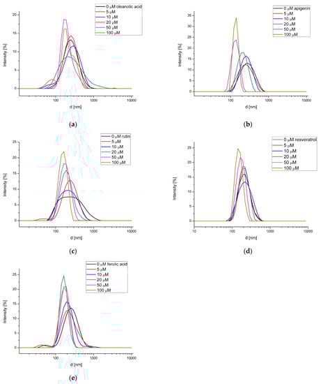 Distribution of PC liposomes hydrodynamic diameter in the presence of oleanolic acid (a), and oleanolic acid mixed with apigenin (b), rutin (c), resveratrol (d) and ferulic acid (e).