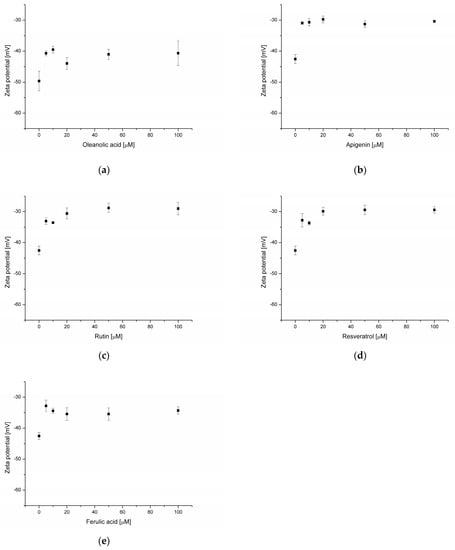 Zeta potential of PC liposomes in the presence of oleanolic acid (a), and oleanolic acid mixed with apigenin (b), rutin (c), resveratrol (d) and ferulic acid (e).