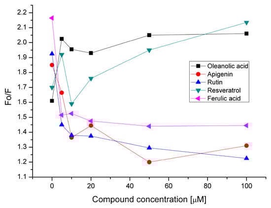 The antioxidant activity of oleanolic acid and phenolic compounds within PC membranes was tested at 25 °C in the presence of the hydrophilic free radical generator AAPH (2,2′-azobis(2-amidinopropane)) after 10 min of incubation in the dark. Liposomes were labeled with DPH, and fluorescence of the probe was measured at excitation wavelength 350 nm and emission wavelength 434 nm. DPH is able to reveal the oxidative events in liposomal membranes as a result of lipid oxidation and the probe’s own oxidation. In such case DPH fluorescence emission decreases due to changes in membrane fluidity as a result of lipid peroxidation and disruption of DPH [23]. Antioxidant activity was calculated on the basis of DPH initial (Fo) and post-incubation (F) fluorescence intensity. The lower Fo/F value was recorded, the higher antioxidant activity of the analyzed compound.