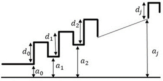 In Figure 2, we show the subsequence of corrugated antenna from waveguide to aperture. Next to those calculations, we proceed to plot antenna 2D sketch. From Formulas (12)–(14), we realize the coordinates of corrugated antenna teeth depend on jth of each slot. This property assists us to figure antenna shape more accurately. From to N, the scale of slots approximately stays unchanged, only gradually rises up. See Figure 2 for more clearances.