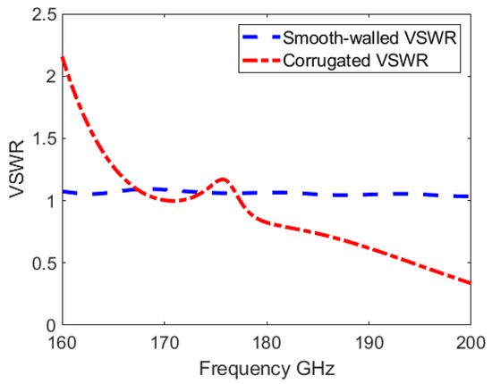 VSWR (Voltage Standing Wave Ratio) comparison of corrugated horn antenna and smooth-walled horn antenna.