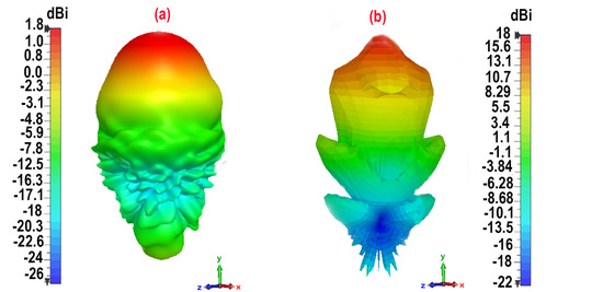 The following figures display the comparison results of the corrugated and smooth-walled antenna simulations in CST software. Through this simulation, we gain the antenna’s performance characteristics, including , VSWR, gain, directivity, and radiation patterns.