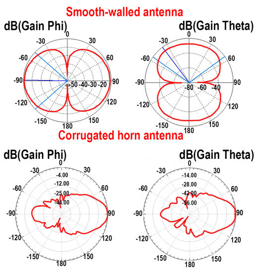- Salim, M.M.; Azim, R.T.; Islam, M.S.; Islam, M.T.; Misran, N. Design of a Wideband Corrugated Horn Antenna with Improved Radiation Characteristics for Remote Sensing Applications. Electronics 2020, 9, 2007. [Google Scholar] [CrossRef]