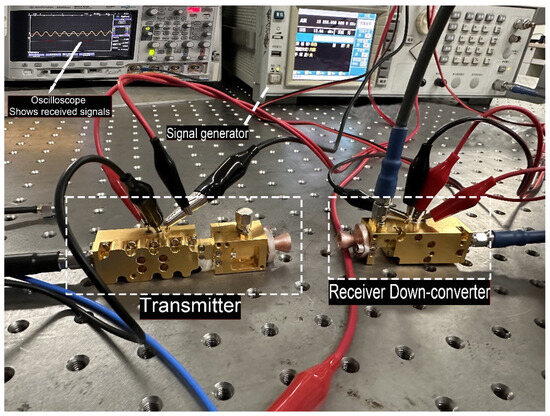 Utilizing the facilities at the Beijing Institute of Technology, we tested the functionality of our smooth-walled antenna design. In our experimental setup, we utilize a 220 GHz multiplier and a 220 GHz mixer to down-convert signals into the frequency range of DC to 3 GHz. This enables us to evaluate the functionality of the antennas in sending and receiving data. In this configuration, one antenna functions as the transmitter, while the other acts as the receiver. As depicted in Figure 10, the transmitter antenna is connected to a receiver, which, in this case, is a 220 GHz multiplier. The multiplier multiplies the 61 GHz input signal with a 12 dB power to generate a 183 GHz signal, which is then transmitted by our smooth-walled antenna. On the receiver side, another smooth-walled antenna is connected to a 22 GHz mixer, with a 6 dB Local Oscillator signal as the entry. This setup down-converts the received signal to a 1 GHz baseband. At this stage of our experiment, our primary objective is to verify the capability of the copper-coated antenna in signal transmission. Figure 10 illustrates the presence of signals on the oscilloscope, confirming the successful transition capability of our antennas. This step serves to demonstrate that the antennas are indeed capable of transmitting and receiving signals. In the subsequent paragraph, we will present practical measurements of the antennas’ VSWR and parameters, further validating the performance of our smooth-walled antennas.