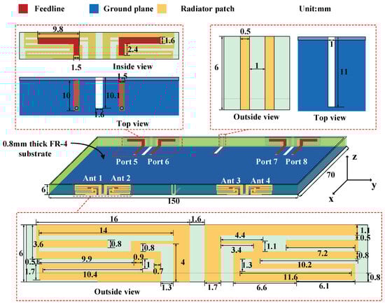 As shown in Figure 1, the system consists of a ground plane of 150 mm × 70 mm with a ring bezel of height 6 mm. The thickness of the substrate is 0.8 mm, the substrate material is FR-4, the relative permittivity is 4.4, the relative permeability is 1, and the loss tangent is 0.02. The antenna element consists of a coupled-feeding structure formed by the inner L-type branch of the substrate and the external radiators of the bezel. The use of coupled-feeding structure is equivalent to adding an equivalent capacitance, which helps to expand the bandwidth. In addition, fine-tuning the geometry of the L-shaped coupling-fed branch can easily realize the impedance matching. Two antenna elements are symmetrically placed to form an antenna pair. To improve the isolation between the antenna pairs, a strip-shaped DGS is etched on the ground plane at the center of the antenna pairs. To improve the isolation between the antenna elements on the adjacent side of the two antenna pairs, the same strip-shaped DGS is etched in the middle of the long side of the system, and two decoupling strips are extended from the ground plane to the frame.