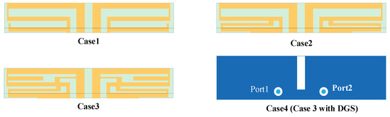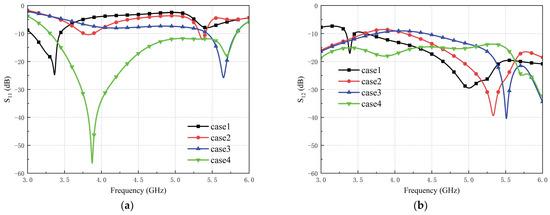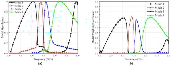 In order to excite more modes in the same plane, we optimized the structure of the external radiator by adding a new L-shaped patch and rectangular patches, whose spatial position exactly corresponds to the L-shaped coupled feed patch (Figure 2 Case 3). This helps to improve the impedance matching of the antenna in the broadband range. Figure 6a shows the MS of Case 3, which introduces two new resonant modes near the center frequency compared to Case 2. The MS of the four modes is mostly greater than 0.7 in the frequency band of interest, and the antenna pair already has good broadband potential. Figure 6b shows that the four modes are able to be excited simultaneously by the same feed source and that mode 1 resonates with mode 4 near 5.7 GHz, producing the most significant resonance point in the 3.3–5.8 GHz range.