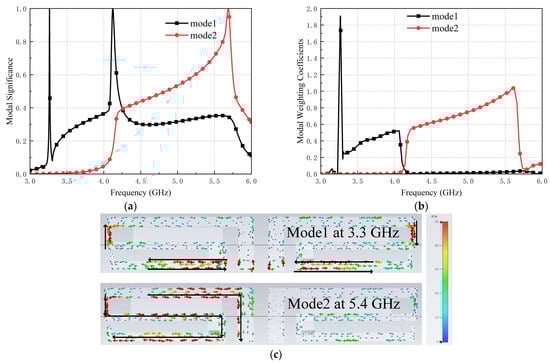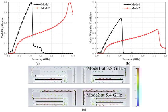 The basis for bandwidth expansion is an S-shaped dual-frequency antenna pair (Figure 2, Case 1). The MS of Case 1 is shown in Figure 4a. Mode 1 and mode 2 do not form a broadband mode but have the potential to form a broadband mode. MWC shows (Figure 4b) that mode 1 and mode 2 are effectively excited at 3.3 GHz and 5.4 GHz, respectively. Figure 4c shows that the characteristic current of mode 1 is mainly concentrated in the part of the patch near the common ground plane, and mode 2 forms two loops between the L-shaped coupled feed patch and the S-shaped external radiator. What the two characteristic currents have in common is that they are both very sensitive at the long side of the S-shaped patch near the common ground plane.