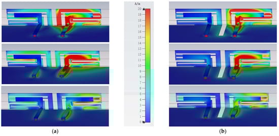 The tight arrangement of the antenna elements reduces the size of the antenna pair but causes the isolation of the antenna pair to become unsatisfactory. Figure 3b shows that Case 3 has the weakest isolation at 4.07 GHz with only −9.02 dB. Figure 7a shows that the surface currents of the antenna pair in the range of 3.3–5 GHz are mainly distributed at the edge of the common ground plane between Ant 1 and Ant 2, which is the main cause of mutual coupling. Therefore, we try to add a 10.1 mm long defective ground structure between Ant 1 and Ant 2 (Case 4). Figure 7b shows that the surface currents that originally flowed from Ant 1 to Ant 2 were effectively curtailed and instead distributed near the defective ground, and the surface currents near the L-shaped coupling feed patch of Ant 2 were also effectively attenuated. Figure 3b shows that the isolation of the antenna pair is significantly improved after the unfavorable surface currents are controlled, and the S12 decreases from −9.02 dB to −16.7 dB at 4.07 GHz, and the maximum value of the S12 decreases from −9.02 dB to −13.77 dB within 3.3–5.8 GHz. It suggests that the defective ground structure incorporated by Case 4 has good band elimination characteristics. On the other hand, it can be clearly observed in Figure 3a that the −10 dB impedance bandwidth of Case 4 is substantially improved compared to Case 3, which completely covers 3.3–5.83 GHz. It indicates that the defected ground structure is able to improve the impedance matching of the antenna pair while weakening the coupling.