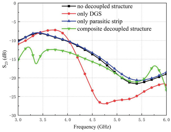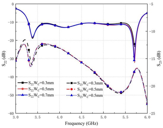 From Figure 11, we can clearly observe that the change in the value of Wc has almost no effect on the impedance matching of the antenna, which is due to the fact that the position of the composite decoupling structure is farther away from the antenna pair. When Wc is 0.3 mm, S22 approaches −10 dB near 5.5 GHz. The reflection coefficient of the high-frequency part and the transmission coefficient of the low-frequency part are improved when Wc is 0.5 mm. When Wc is more than 0.5 mm, the reflection coefficient and the transmission coefficient are almost unchanged. Therefore, we chose the parasitic band structure with a Wc of 0.5 mm.