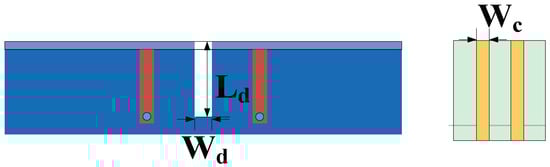 In order to further understand the effect of the proposed decoupling structure on the antenna performance, we analyze the DGS at the center of the antenna pair and the key parameters of the composite decoupling structure. As shown in Figure 9, the length of the strip defect land at the center of the antenna pair is set to be Ld, the width to be Wd, and the width of the parasitic strip to be Wc.