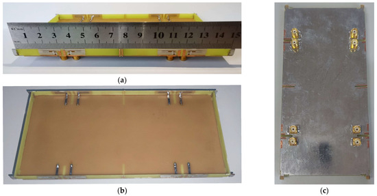 The fabricated eight-element antenna system prototype is shown in Figure 12; Figure 12a shows the side frames where the two pairs of antennas are placed; Figure 12b shows the interior of the prototype as well as the L-shaped coupled feed branch; Figure 12c shows the defective ground structure of the prototype’s metal common ground plane; and eight SMA connectors were soldered at the back ports of the prototype for testing. Similar results are no longer shown due to the symmetrical arrangement of the MIMO system.