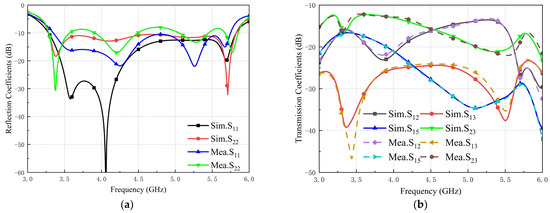 (a) Simulated and measured reflection coefficients. (b) Simulated and measured trans-mission coefficients.