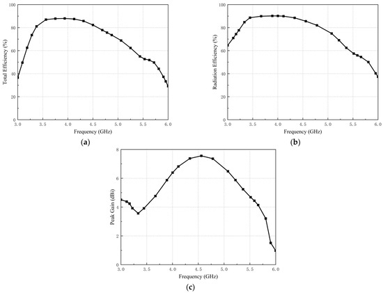 As shown in Figure 14a, the total efficiency of the antenna is generally better than 50% and up to 88% in the N77/N78/N79 bands with the WLAN 5GHz band. Figure 14b shows the radiation efficiency of the antenna. By comparing Figure 14a with Figure 14b, it is found that the effect of conductor dielectric loss on the overall performance of the antenna is not significant at the operating frequency bands of the antenna. The total efficiency of the antenna is relatively low in the WLAN 5 GHz band, but the antenna efficiencies are all better than 60% at the main operating frequencies that we are interested in (N77/N78/N79). The peak gain is shown in Figure 14c and takes values ranging from 3.6 to 7.6 dBi.
