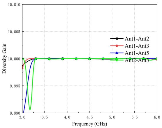 The diversity gain is correlated with the envelope correlation coefficient. In Figure 16, it can be clearly observed that the DG is higher than 9.99 dB at an operating frequency of between 3.30 and 5.83 GHz, indicating that the diversity gain performs well.