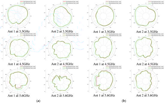 Due to the mirror symmetry of the arrangement of the eight-element antenna array, we measured the 2D directional maps of Ant 1 and Ant 2 at the three resonance points of 3.5, 4.5, and 5.6 GHz, respectively. Figure 17a shows the simulated and measured xoy-plane radiation patterns, and Figure 17b shows the simulated and measured xoz-plane radiation patterns. From Figure 17, we can see that there is only a slight difference between the simulated and actual measured antenna radiation direction diagrams, which is caused by manufacturing and testing errors. From Figure 17a,b, we can clearly observe that, thanks to the symmetric structure of the antenna pairs, the maximum radiation directions of Ant 1 and Ant 2 are well complementary thanks to the symmetric structure of the antenna pairs. That ensures that the proposed eight-element MIMO antenna system has good omnidirectionality and spatial independence, and the overall performance of MIMO antenna arrays is good and suitable for the application of 5G mobile terminals.