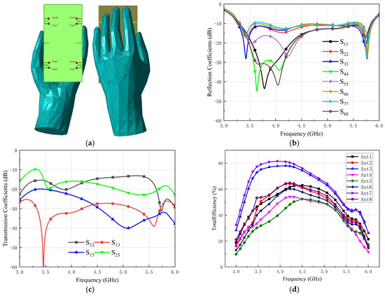 We simulate the effect of the user’s hand on the antenna performance of an MIMO cell phone when making a phone call or browsing for information, and verify the robustness of the MIMO antenna system. The poses of the simulated handheld antenna model are shown in Figure 18a, with antennas 1, 2, 5, and 6 close to the palm and antennas 3, 4, 7, and 8 close to the fingers. In Figure 18b, we can clearly observe that the reflection coefficient of Ant 7 is slightly larger than −10 dB at 3.6 GHz and 5.5 GHz, and slightly more than −10 dB at 5.6 GHz for Ant 5. This is due to the fact that the human body tissues themselves belong to a kind of conductive material. The thumb portion of the hand model is relatively close to the Ant 5 and Ant 7, which absorbs and scatters the electromagnetic waves radiated by Ant 5 and Ant 7 and scattering. Overall, the reflection coefficients of antennas 1–8 are weakly affected in the frequency band from 3.30 to 5.83 GHz.