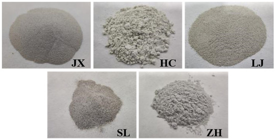 Five S-FCC catalysts, namely JX, HC, LJ, SL, and ZH (Figure 1), were chosen as additives following appropriate treatment. These catalysts were acquired from Qingdao Huicheng Environmental Protection Technology Co. To assess their properties, the surface area, hydrophilic coefficient, and density of the S-FCC-C samples and mineral powder were measured in accordance with the guidelines outlined in a Chinese professional standard [33], titled “Test Procedure for Aggregates in Highway Engineering”. The results of these tests are presented in Table 1. The JX, LJ, SL, and ZH spent FCC catalysts are gray powders with a surface area of 100+ m2/g. HC is a white powder with the lowest surface area and hydrophilic coefficient among the five catalysts, suggesting it has the greatest hydrophobicity. All the spent catalysts were used after metal ion leaching treatment to ensure that they were environmentally friendly.