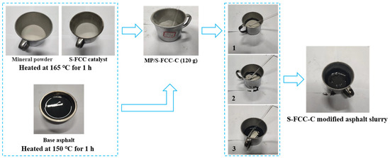 First, the base asphalt was heated to a temperature of 150 °C for 1 h. Simultaneously, the mineral powder (MP) and S-FCC catalyst were heated to 165 °C for 1 h. Subsequently, the MP and the S-FCC-C (120 g) were blended at a temperature of 165 °C at varying weight ratios of W/W = 4/1, 3/2, 2/3, 1/4, and 0/1, corresponding to S-FCC-C dosages of 20%, 40%, 60%, 80%, and 100%. Finally, the hot base asphalt (100 g) was added to the mixture of MP/S-FCC in three separate batches, followed by a shearing process lasting 30 min at a temperature of 150 °C. The preparation process is visually depicted in Figure 2.