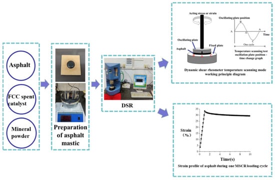The characterization of the high-temperature rheological properties of asphalt mastics was conducted using a dynamic shear rheometer (DSR) for both the temperature scan test and the multiple stress creep recovery (MSCR) test. The instrument used for these tests was the Bohlin Gemini2 dynamic shear rheometer from Malvern Instruments. The experimental procedure is presented in Figure 3. All the tests were repeated three times, and the average values were obtained.