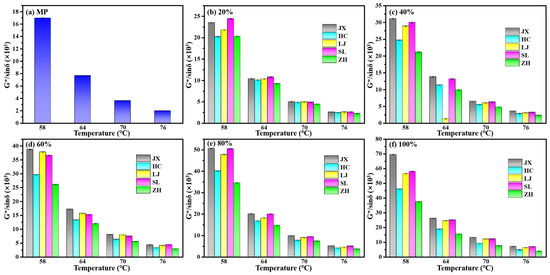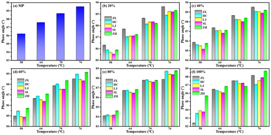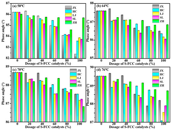 To investigate the influence of high temperature on the rheological properties of asphalt mortar with different S-FCC-C substitution doses, the phase angle variation trend of S-FCC-C-modified asphalt slurry with temperatures at various doping levels was analyzed, as presented in Figure 5. From the figure, it can be observed that except for JX at 80% substitution dose and HC at 100% substitution dose, the phase angles consistently increased as the temperature rose from 58 °C to 76 °C. This shift indicates that the asphalt mastic gradually transitioned into a more viscous state, and the elevated temperatures adversely affected the internal structure of the modified asphalt mastic, leading to reduced stability. Notably, the rising phase angles of the two aforementioned samples indicate a deviation from the overall trend, potentially attributed to specific characteristics of their compositions [41]. In general, the phase angles of the five S-FCC-C modified asphalt slurries were smaller when compared to those of the pure mineral powder asphalt slurry, with a more pronounced effect observed at higher S-FCC-C admixture levels. This phenomenon suggests that the inclusion of S-FCC-Cs resulted in a thinner asphalt film on the powder’s surface within the asphalt mastic, particularly with increased doping amounts. Consequently, the structural asphalt content was higher, resulting in enhanced overall strength of the mastic.