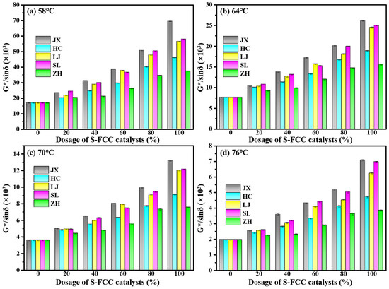 Rutting factor-temperature change diagram of S-FCC catalyst-modified asphalt mortar with different dosages.