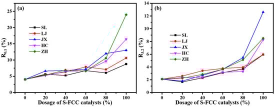 Variation in deformation recovery rate R tested under 0.1 kPa (a) and 3.2 kPa (b) of S-FCC catalyst-modified asphalt mortar with dosage.