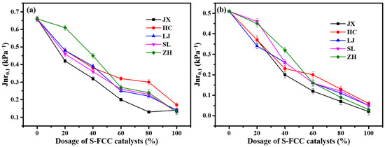 Diagram of unrecoverable creep modulus Jnr tested under 0.1 kPa (a) and 3.2 kPa (b) of S-FCC-C-modified asphalt mortar with dosage.