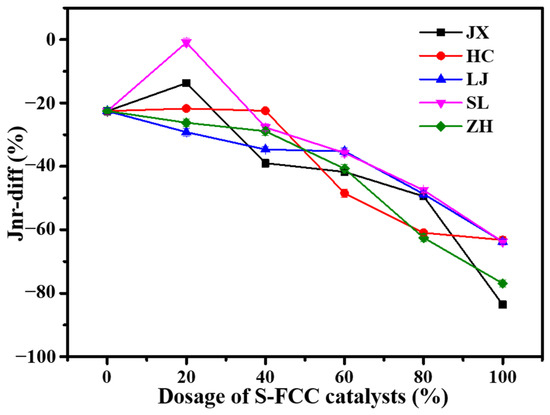 Jnr-diff relationship between the replacement amount of S-FCC catalyst and the irrecoverable creep compliance difference at 60 °C.