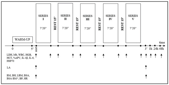 Before the pulsatile exercise at both temperatures, participants underwent a 30 min acclimatization to the thermal conditions. This was followed by a 5 min warm-up at an individually tailored load of 50 ± 1% VO2max. The warm-up maintained a frequency of 60 rev·min−1 and incorporated three 5 s maximal accelerations at the 2nd, 4th, and 5th minutes. During each sequence of the pulsatile test—modified from the Wingate test for both lower (LL) and upper (UL) limbs—fundamental Wingate test metrics were recorded. The load remained consistent for each sequence: 8.3% of body mass for LL and 4.5% for UL. Moreover, before and after the five series of the pulsatile test, biochemical markers were identified from blood samples taken at intervals of 1, 24, and 48 h. These markers included interleukin-1β (IL-1β), interleukin-6 (IL-6), and heat shock proteins (HSP-70). To gauge muscle cell damage, metrics like lactate dehydrogenase (LDH) activity, myoglobin (Mb) concentration, leukocyte (WBC) count, hemoglobin (HGB) concentration, hematocrit (HCT) count, and changes in plasma volume (%ΔPV) were considered. The pulse test interval was structured to mimic the pattern of judo tournament matches, a design derived from an analysis of actual matches. This approach was inspired by related studies in the literature [28,29].