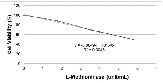 The 5,5-dithio-bis-2-nitrobenzoic acid (DTNB) method was employed to assess enzyme activity by measuring the number of free thiol groups [25]. The enzyme solution was mixed with 20 mM of L-methionine in phosphate-buffered saline (PBS) (pH: 7.2), 0.1 mM pyridoxal-5-phopsphate (PLP), and 0.25 mM (DTNB) at a final volume of 1 mL. The mixture was incubated for 1 h at 37 °C in an incubator (Memmert, Schwabach, Germany). Absorbance was measured at 420 nm using the Cary 60 UV-Vis spectrophotometer (Agilent, Santa Clara, CA, USA). The number of thiol groups was calculated from the standard curve of sodium methanethiolate. Enzyme activity was expressed as the amount of enzyme that released 1 µmol of free thiol per minute under optimal assay conditions, defined as L-methioninase activity.