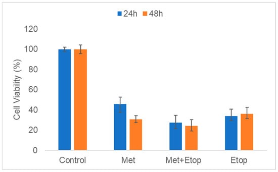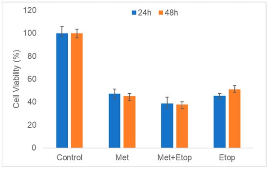 To assess the combined effect of L-methioninase and etoposide on U87MG and T98G cells, they were exposed to different treatments, including etoposide alone, L-methioninase + etoposide, and L-methioninase alone, for 24 and 48 h. The viability of these cells was measured using the neutral red assay to evaluate the combined effect of the determined IC50 value of the L-methioninase enzyme solution and the chemotherapy drug etoposide. Etoposide was used at a concentration of 40 µM, which was determined to be the IC50 value for U87MG cells in our previous study [32]. Etoposide was used at a concentration of 29 µM in the T98G cell line, which was determined as the IC50 value in the study performed by Sevim et al. [33].