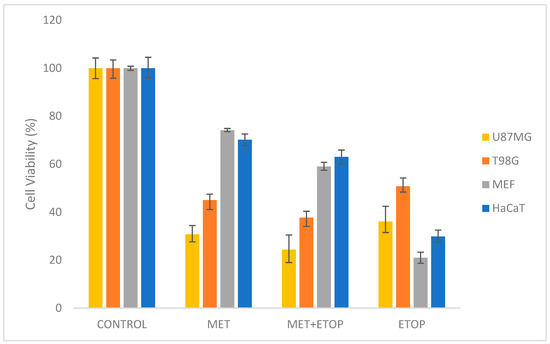 Cytotoxicity of L-methioninase, etoposide and combination of both on MEF, HaCat, U87MG and T98G cells for 24 h of incubation (p < 0.001).