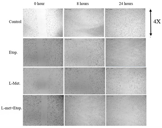 The wound closure status of T98G cells over 24 h. L-methioninase and etoposide inhibited the wound closure with both sole and combined administration. In control plates, glioblastoma T98G cells closed the wound in 24 h of incubation (p < 0.001).