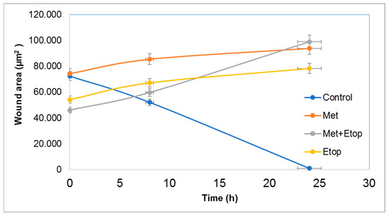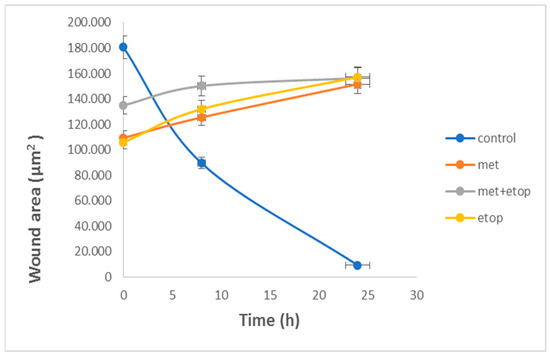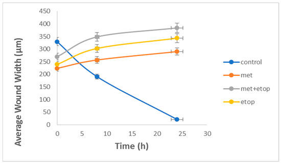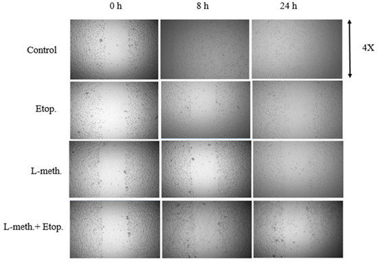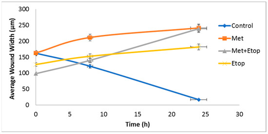 The migration assay was performed by calculating the wound area and average wound width using ImageJ software. For U87MG cells, the graphs of wound area and average wound width change clearly demonstrate that the presence of L-methioninase, etoposide, and their combination inhibited wound closure over a 24 h period (Figure 9 and Figure 10). A slight increase in the use of both L-methioninase and etoposide, which are cytotoxically powerful, started to kill some cells after 24 h of incubation.