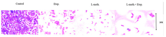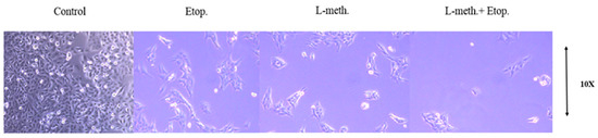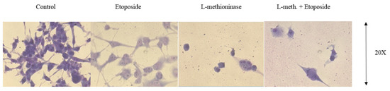 Giemsa staining was used to observe U87MG and T98G cells during treatment with L-methioninase, and etoposide indicated significant morphological changes and cytotoxic activity in the cells. The star-shaped cells eventually disappeared, and the cells became individual and weakened. This change suggests that treatment with L-methioninase and etoposide affects the cytoskeletal organization and cellular adhesion of glioblastoma U87MG and T98G cells. In addition, some cells became round in shape. This change in cell shape is often associated with cellular stress and the induction of programmed cell death. The rounding-up of cells can be indicative of the cytotoxic effects of L-methioninase and etoposide on treated cells. Furthermore, the number of cells decreased sharply. This suggested that the cytotoxic activity of L-methioninase and etoposide led to a significant reduction in the number of viable cells. Morphology changes after giemsa staining can be seen for both U87MG and T98G cells (Figure 15 and Figure 16).