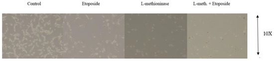 In addition to the cytotoxicity of L-methioninase and etoposide against glioblastoma U87MG and T98G cells, their cytotoxic activity against normal cells was evaluated using a neutral red assay. Therefore, MEF and HaCaT cells were used. Based on the results obtained from the 24 h culture of MEF cells, L-methioninase exhibited lower cytotoxicity than etoposide.These results indicated that L-methioninase is less cytotoxic against normal cells even though it contributes less cytotoxic activity to etoposide and alleviates the side effects of etoposide against normal mammalian cells (Figure 6).