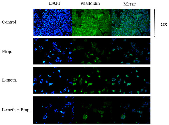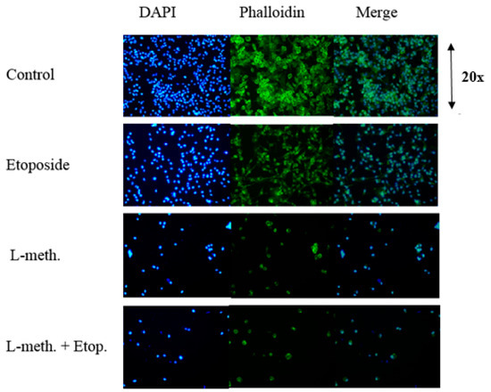 DAPI and F-actin staining of U87MG cells at the end of 24 h incubation. Nucleus and F-actin filament intensity significantly dropped after L-methioninase and etoposide administration. Star-shape formation of glioblastoma U87MG cells was seen to be more rounded, as shown by F-actin staining after cytotoxic activates occurred using L-methioninase and etoposide.
